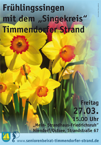 Der Seniorenbeirat hatte zu einem „Frühlingssingen“ am 27.3.15 in das Hotel „Mein Strandhaus“ in Niendorf/Ostsee eingeladen. Nach einem gemütlichen Kaffeetrinken begann der Frauenchor „Singekreis“ Timmendorfer Strand, unter der Chorleiterin Margarita Riebe, mit ihren 24 Sängerinnen mit dem Gesangsnachmittag. Hierzu wurde eigens ein anspruchsvolles Programm einstudiert. Die stimmungsvoll vorgetragenen Frühlingslieder setzten beim Publikum Emotionen frei und wurden mit viel Beifall bedacht. In der Pause des Chores verstand es Frau Heidi Döhring mit lustigen Geschichten die Gäste zum Lachen zu bringen. Im weiteren Verlauf der Veranstaltung wurden alle Anwesende mit bekannten Frühlingsliedern in den Gesang mit eingebunden, was sichtlich Freude und Spaß hervor rief. Die Chorleiterin verstand es, das Publikum selbst in einen Kanon mit dem Chor einzubinden, was auch auf Anhieb klappte.