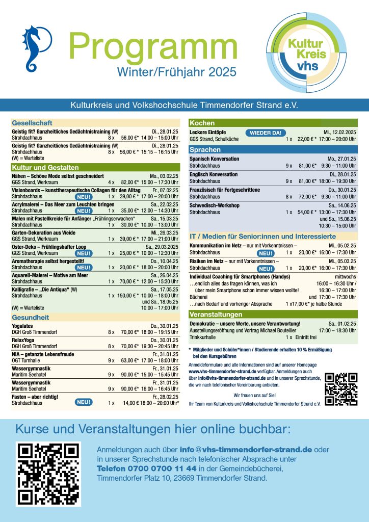 Die VHS Timmendorfer Strand startet mit folgenden Kursen nach der Winterpause. Online-Anmeldungen über www.vhs-timmendorfer-strand.de, E- Mail: info@vhs-timmendorfer-strand.de oder Telefon: 0700 0700 1144 (Ortstarif)