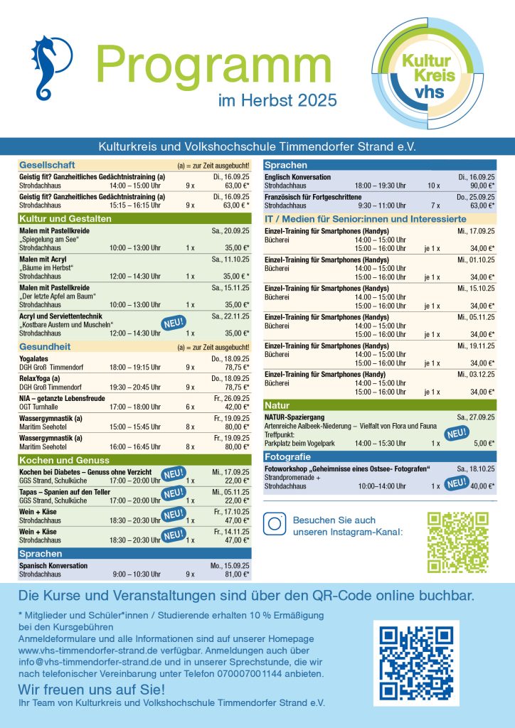 Die VHS Timmendorfer Strand startet mit folgenden Kursen nach derSommerpause. Online-Anmeldungen über www.vhs-timmendorfer-strand.de, E- Mail: info@vhs-timmendorfer-strand.de oder Telefon: 0700 0700 1144 (Ortstarif). Den aktuellen Flyer finden sie in den Tourist-Infos sowie in der Gemeindeverwaltung bzw. hier zum Download: Programm ab 15.09.2025